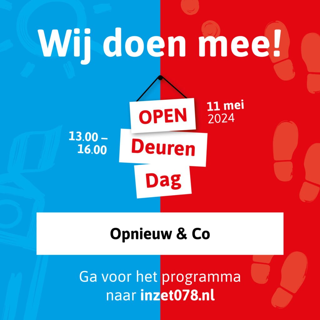 Opnieuw & Co Dordrecht aan de Merwedestraat 52-54 doet zaterdag 11 mei mee aan de Open Deuren Dag. Op deze dag openen allerlei Dordtse vrijwilligersorganisaties hun deuren voor een kijkje achter de schermen van het vrijwilligerswerk. Daarnaast staan we met een kraam op de Beleefmarkt in het Hof.